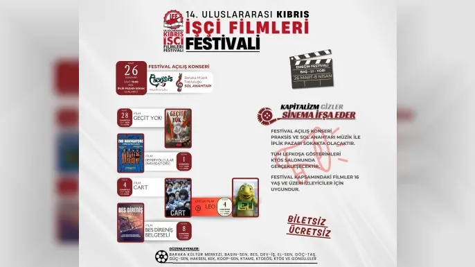 14. Uluslararası Kıbrıs İşçi Filmleri Festivali, “Kapitalizm gizler, sinema ifşa eder” temasıyla bu yıl 26 Mart-8 Nisan tarihleri arasında yapılıyor.