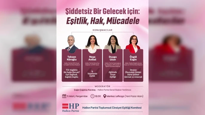 “HP Merkez Yürütme Kurulu (MYK) Üyesi ve Sağlık Komitesi Başkanı Teksen Köroğlu, ‘Toplumsal Cinsiyet Eşitliği Sağlıkta Ne Kadar Gerçek? Eşit Değilsek Sağlıklı Değiliz’; HP Girne İlçe Başkanı ve MYK Üyesi Neşe Anibal ‘İş Yaşamında Eşitlik’; HP Gazimağusa İlçe Başkanı ve MYK Üyesi Eğitim Komitesi Başkanı Duygu Uzun ‘Eğitimde Fırsat Eşitliği’; HP Disiplin Kurulu Üyesi ve Toplumsal Cinsiyet Eşitliği Komitesi Başkanı Özgül Ezgin de ‘Ekranın Ötesindeki Şiddet: Dijital Şiddeti Görmek ve Anlamak.’ ”